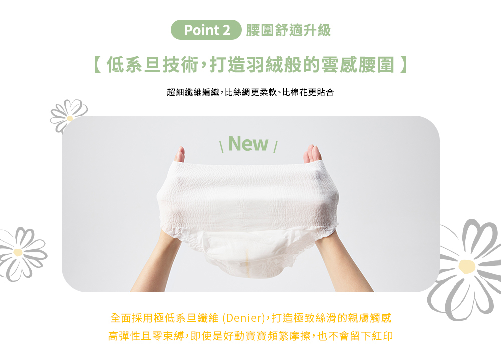 .腰圍材質全新進化,為寶寶打造如羽絨般的「雲感腰圍」